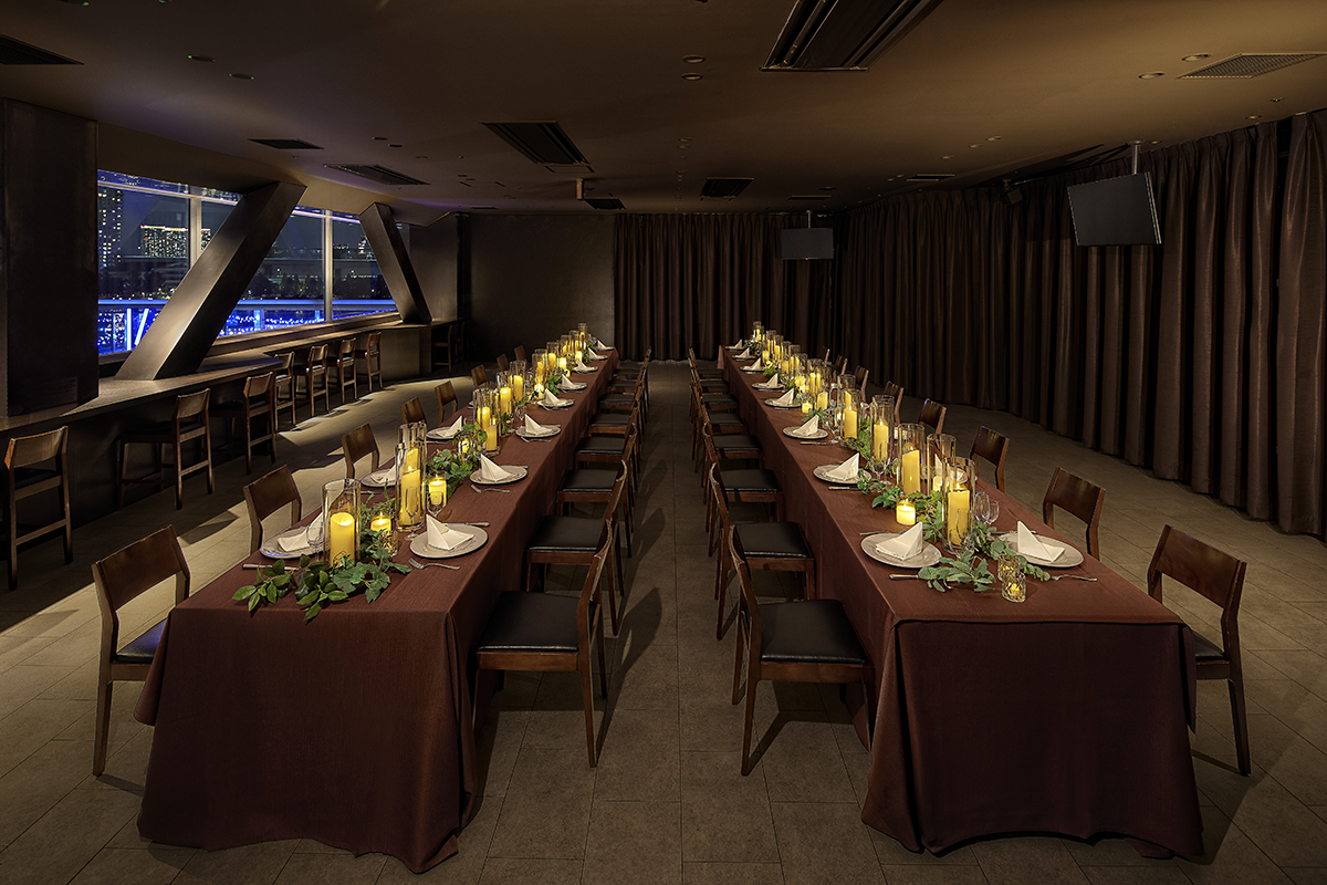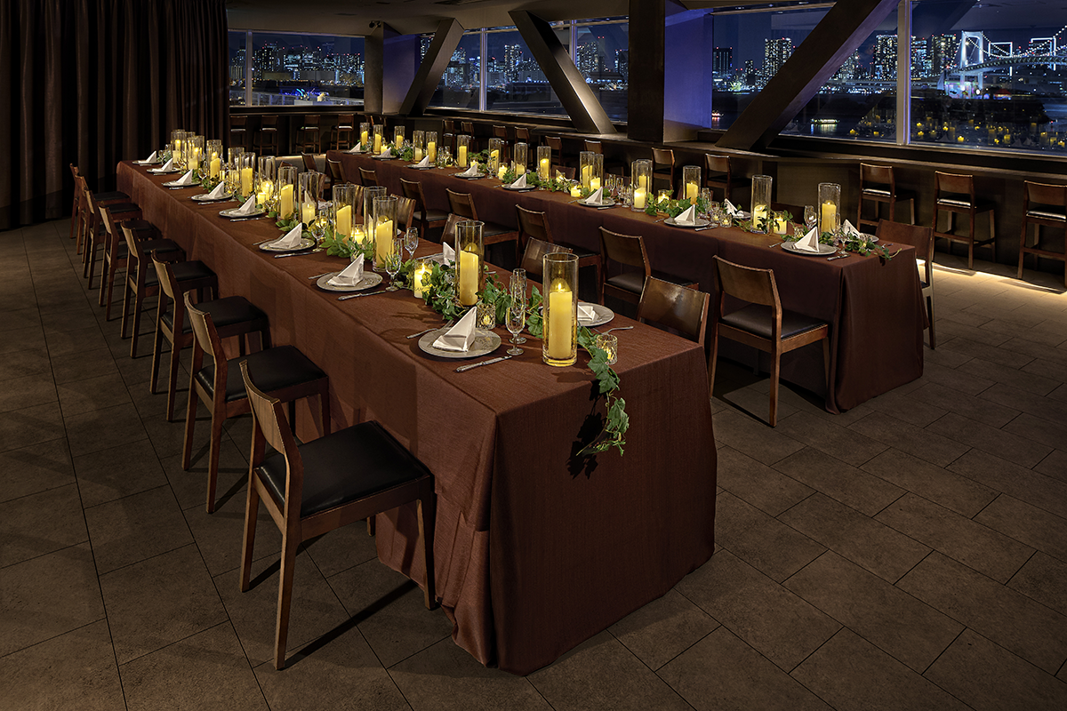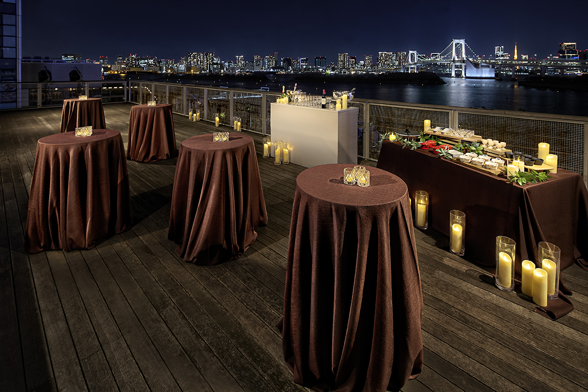 At the sophisticated and urban Frame Café on the 3rd floor, you can host dramatic parties in a location that takes full advantage of the panoramic views of Tokyo Bay and the Rainbow Bridge. What’s more, the outdoor deck extending beyond the café can host open-air standing receptions. On the first floor, the main stage equipped with high-tech facilities can be utilized for cocktail parties with a live-performance feel.