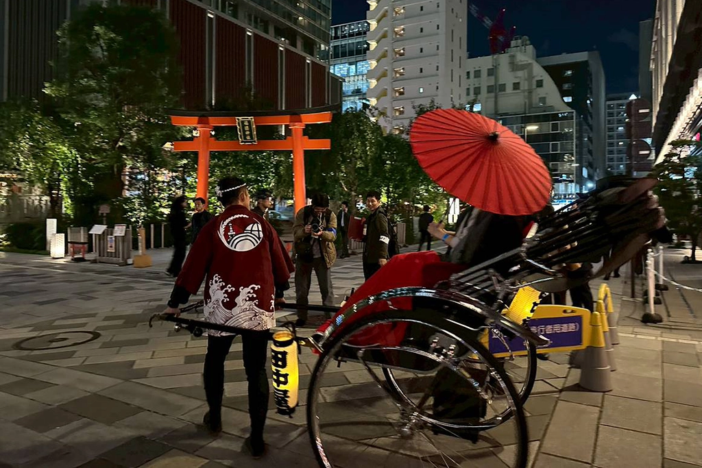 At Nihonbashi Naka-dori, welcome drinks and light refreshments were served with the cooperation of local shops and festival stalls, and rickshaws added to the lively ambiance.