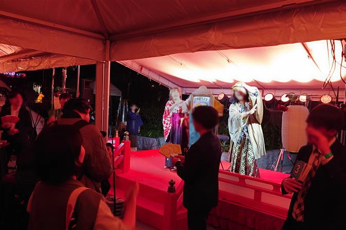 At Fukutoku Garden, guests enjoyed a vibrant program of traditional Japanese cultural experiences. The entertainment included Daikagura juggling and acrobatics, a reenacted oiran parade from the Edo period, dynamic lion dances, and kamishibai picture‑card storytelling with audience quizzes. Guests also sampled authentic kaiseki cuisine and sake. Although the weather remained clear, tents were intentionally set up as part of the showcase design, allowing organizers to test how outdoor venues can respond to rain and other environmental conditions.