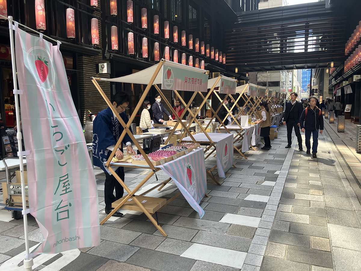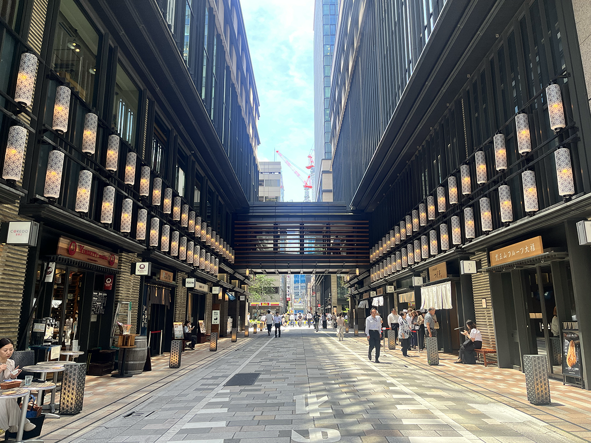 Nihonbashi Naka-dori, which can be reached by going down the street between Nihonbashi’s Coredo Muromachi Complexes 1 and 2 that leads to the O-torii (shrine’s red gate) of Fukutoku Shrine, is a location where you can feel the traditional culture of Tokyo. Between 11 am to 8 pm when the pedestrian-only zone opens, you will see many visitors taking pictures in front of colorful lanterns that change with the seasons. This whole street can also be used for holding events.